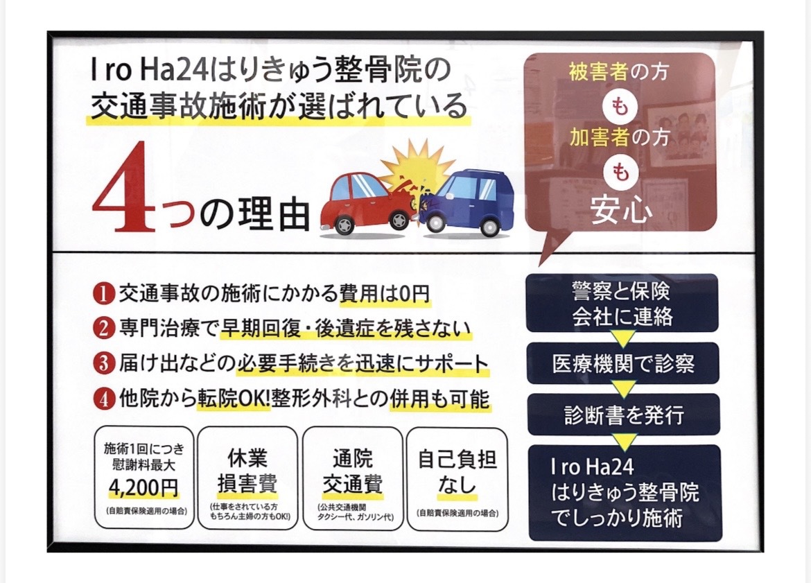 整体やマッサージ、鍼灸など、様々な治療法を組み合わせて、患者様の症状に最適アプローチを提供します。交通事故後の不安や痛みには、I ro Ha24はり・きゅう整骨院では健康保険が使えますのでサービスをご活用ください。